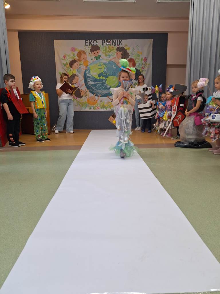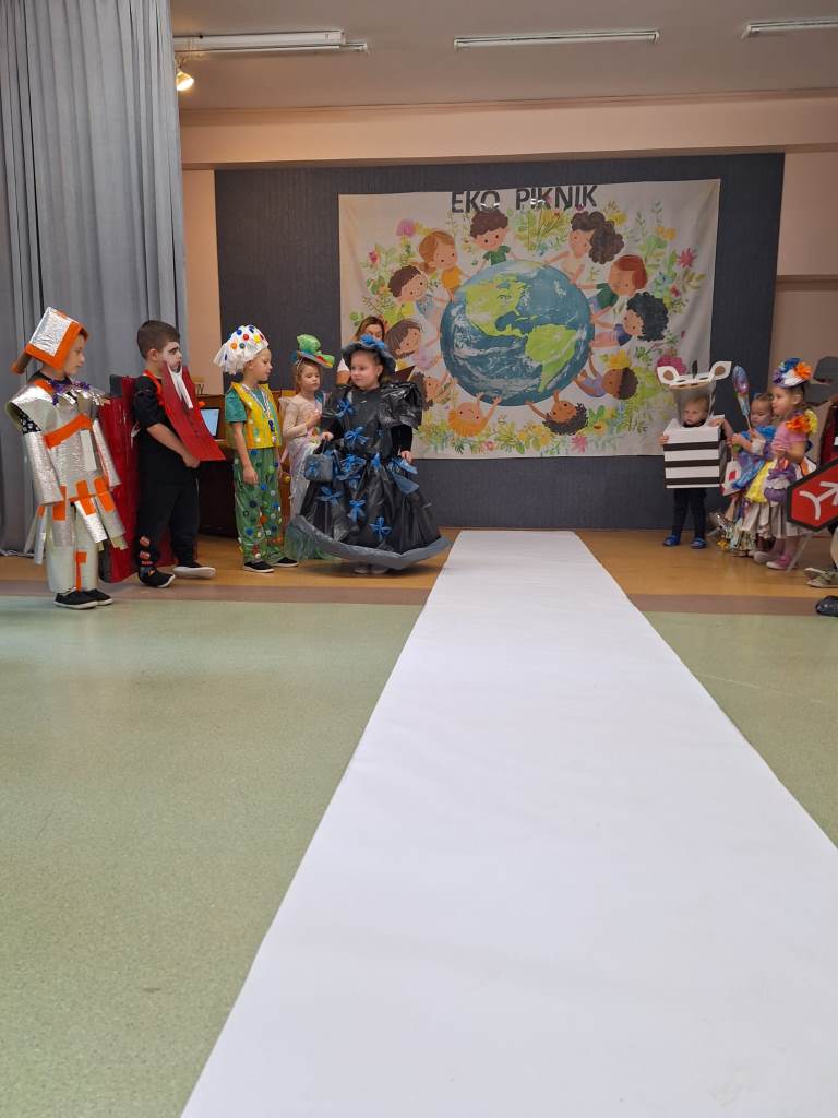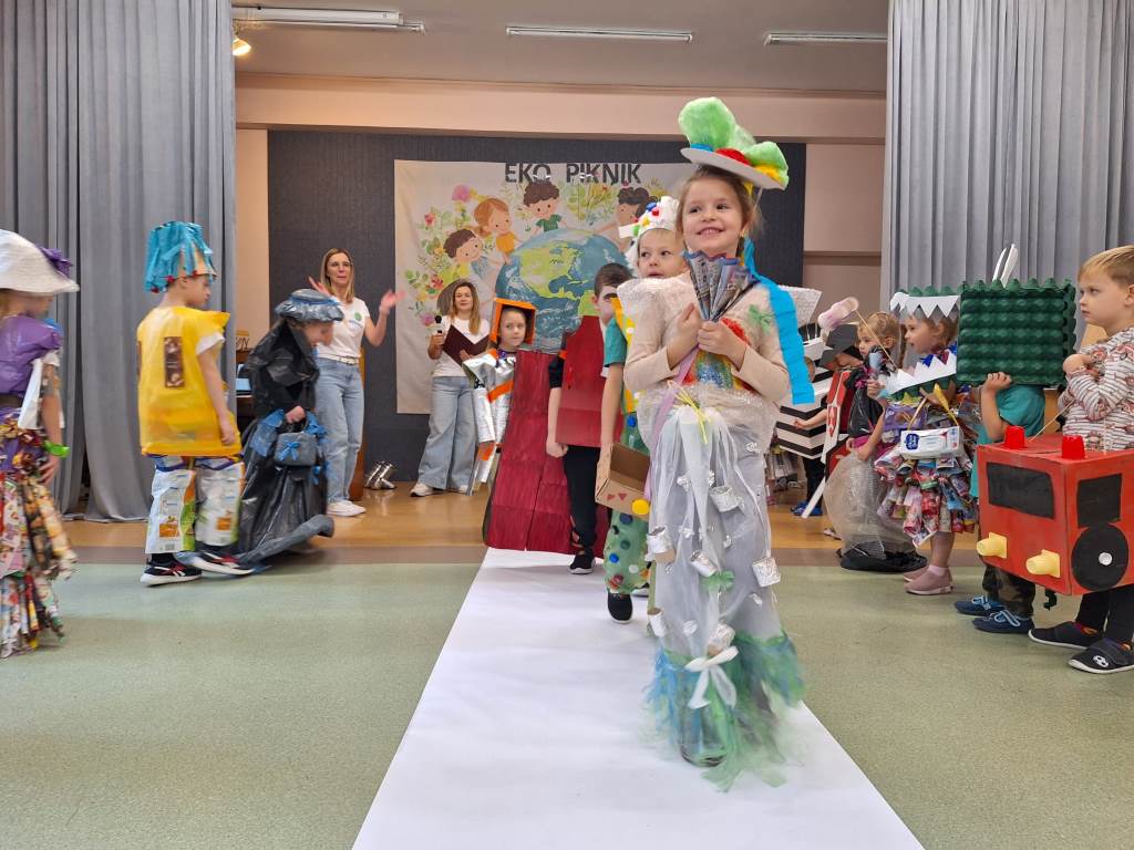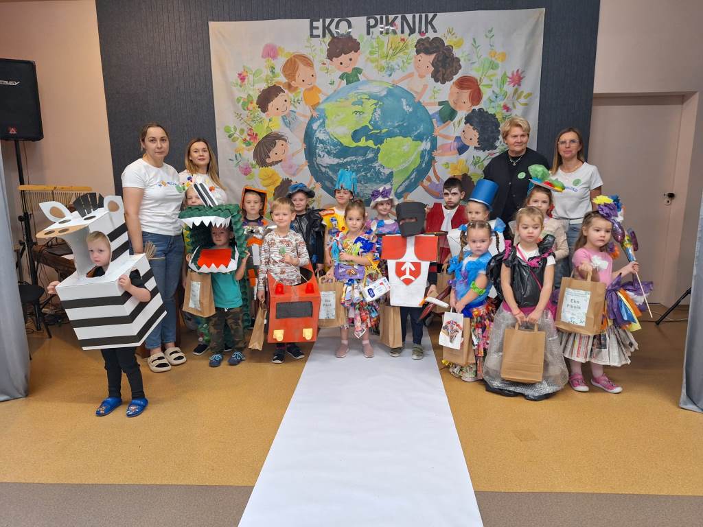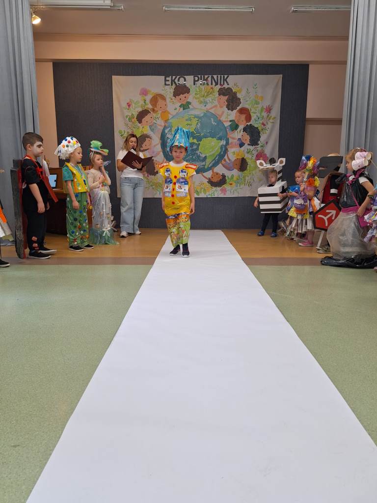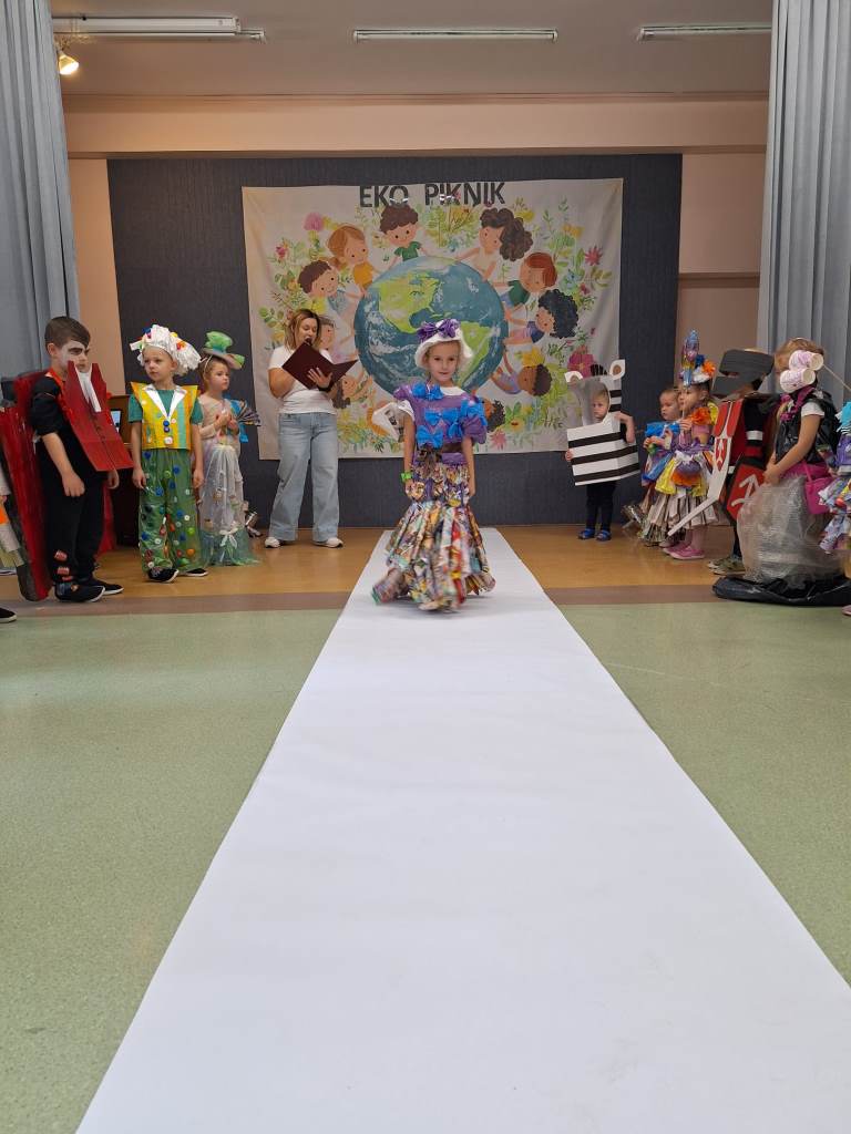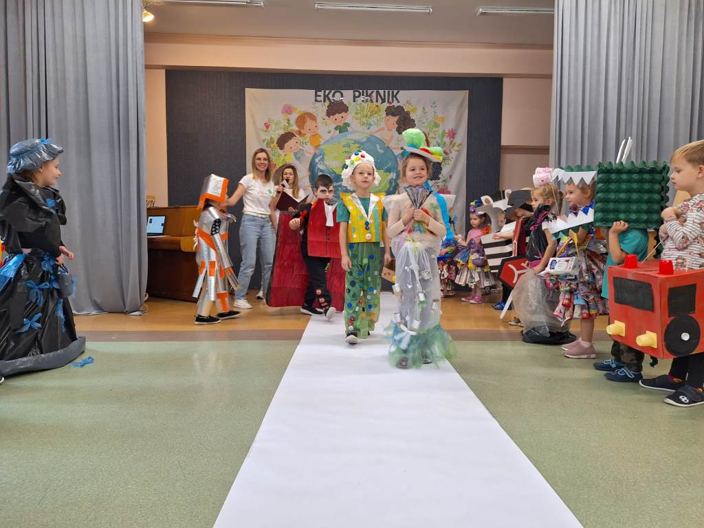 Eko Piknik okazał się wydarzeniem pełnym radości i kreatywności, a największą atrakcją okazał się ekologiczny pokaz mody. Dzieci zaprezentowały stroje wykonane wspólnie z rodzicami z materiałów przezznaczonych do recyklingu - papieru, folii, tektury czy butelek plastikowych, a maili modele z dumą prezentowali swoje kreacje na specjalnie przygotowanym "ekologicznym wybiegu". Gośćmi specjalnymi eko pokazu byli uczniowe klas pierwszych Szkoły Podstawowej w Kotlinie. Wspólna zabawa wzmocniła współracę ze szkołą podstawową i zaangażowanie całej spłeczności przedszkolnej.
