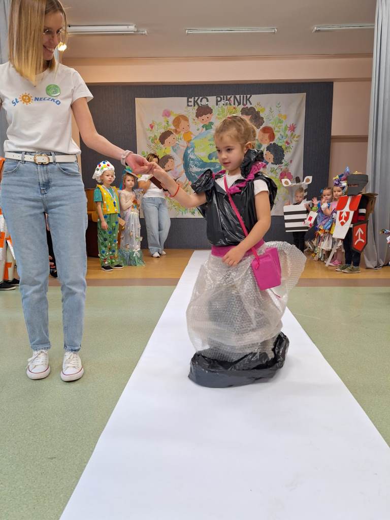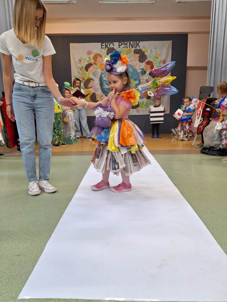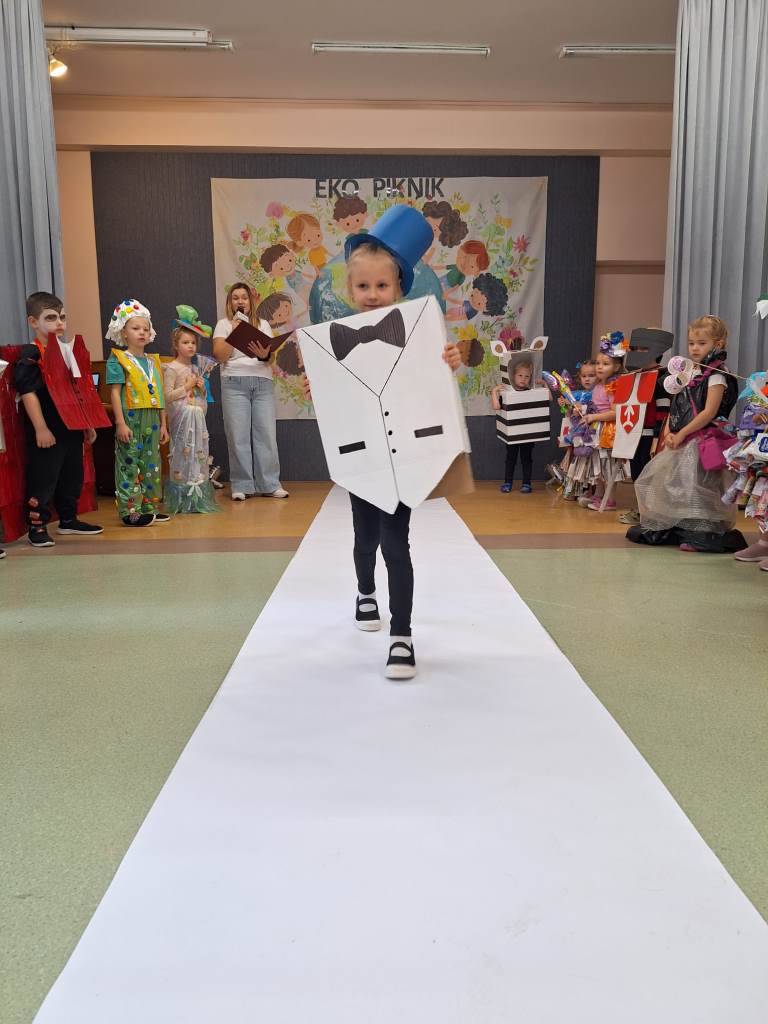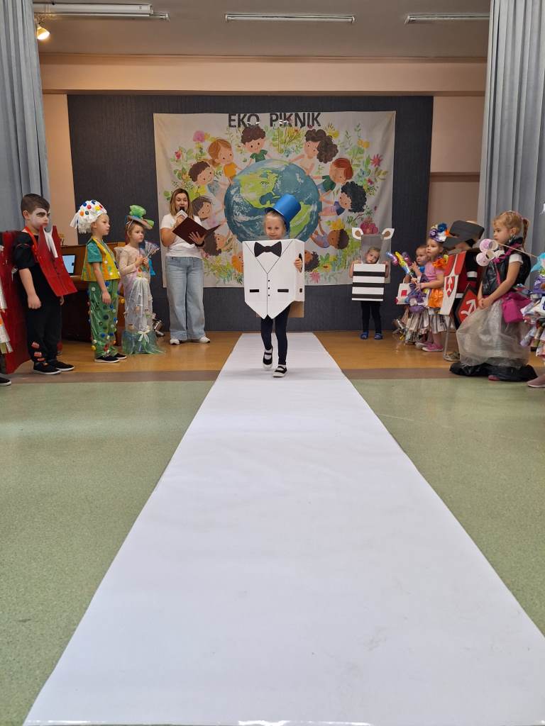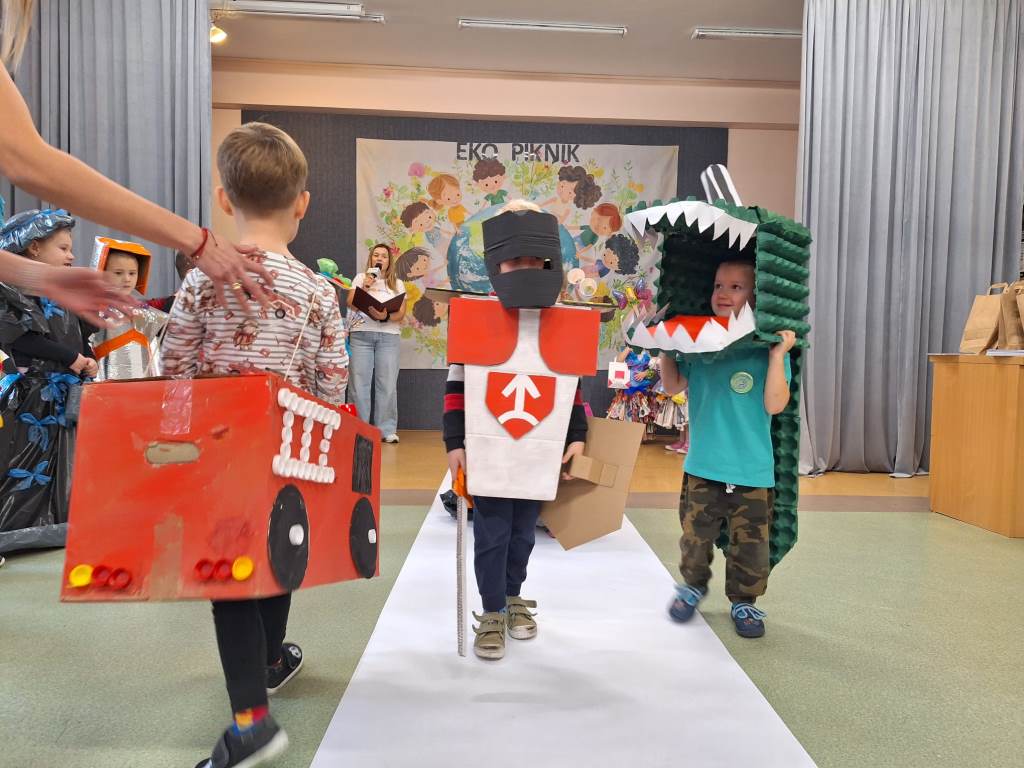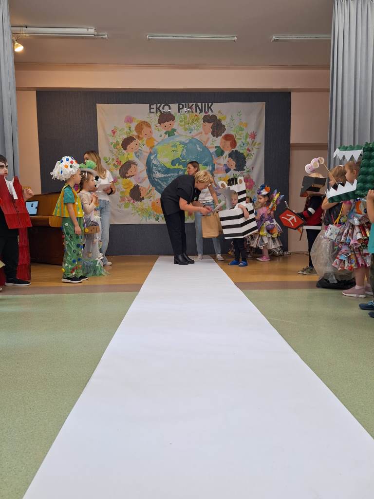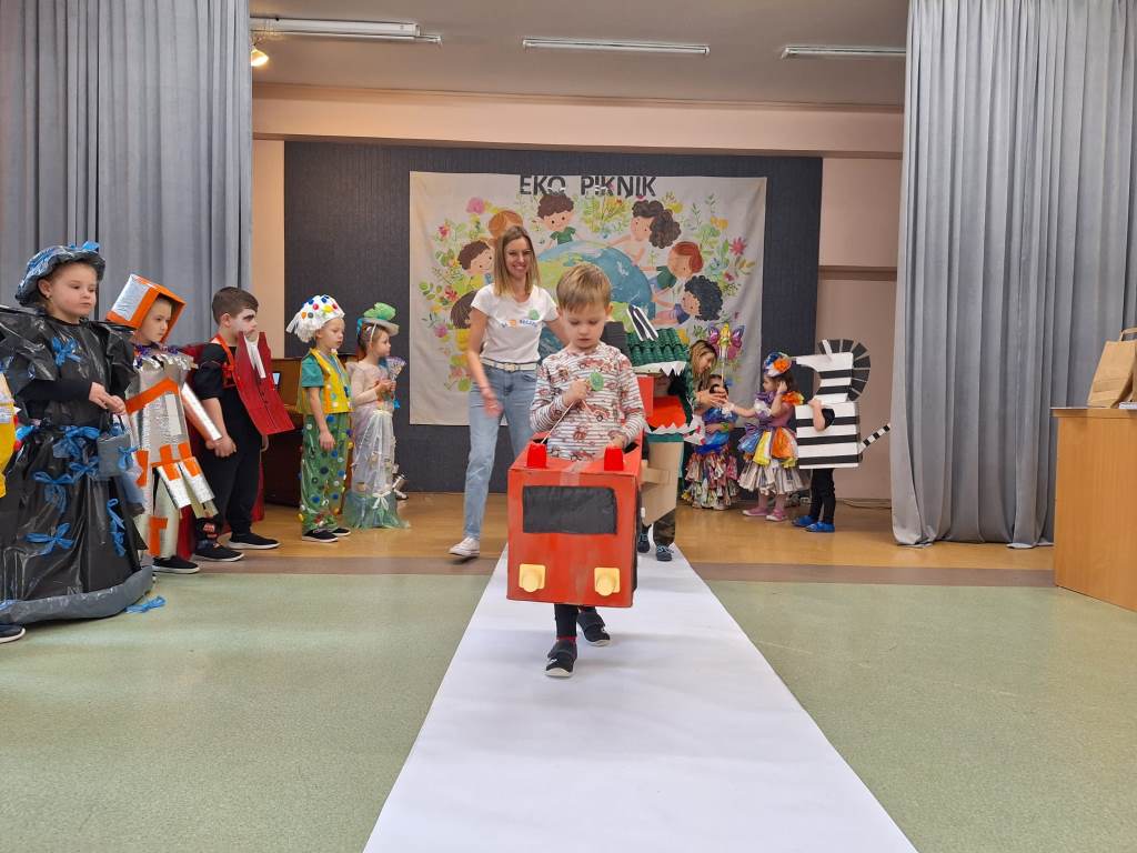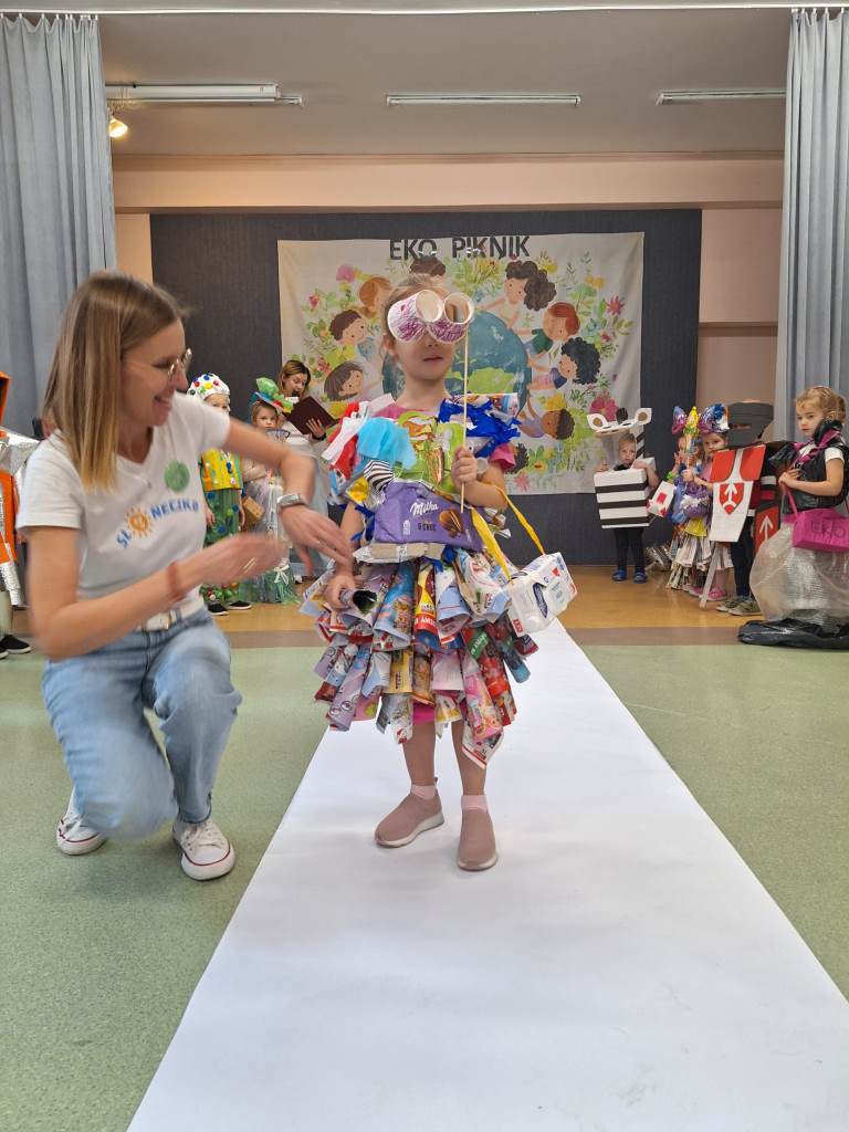 Eko Piknik okazał się wydarzeniem pełnym radości i kreatywności, a największą atrakcją okazał się ekologiczny pokaz mody. Dzieci zaprezentowały stroje wykonane wspólnie z rodzicami z materiałów przezznaczonych do recyklingu - papieru, folii, tektury czy butelek plastikowych, a maili modele z dumą prezentowali swoje kreacje na specjalnie przygotowanym "ekologicznym wybiegu". Gośćmi specjalnymi eko pokazu byli uczniowe klas pierwszych Szkoły Podstawowej w Kotlinie. Wspólna zabawa wzmocniła współracę ze szkołą podstawową i zaangażowanie całej spłeczności przedszkolnej.