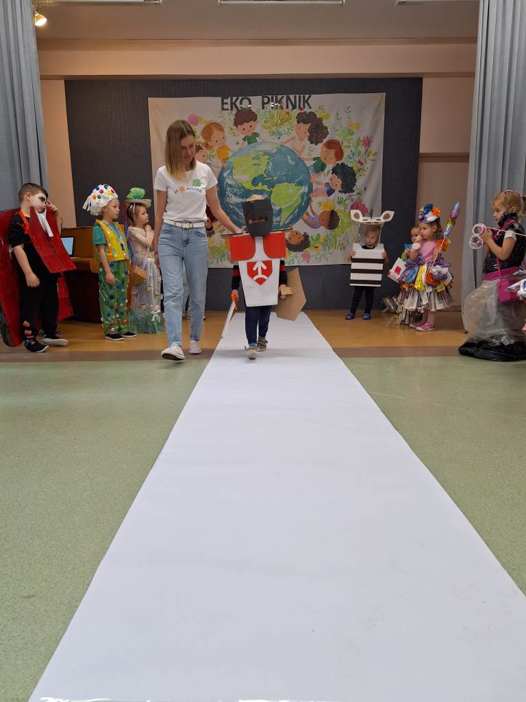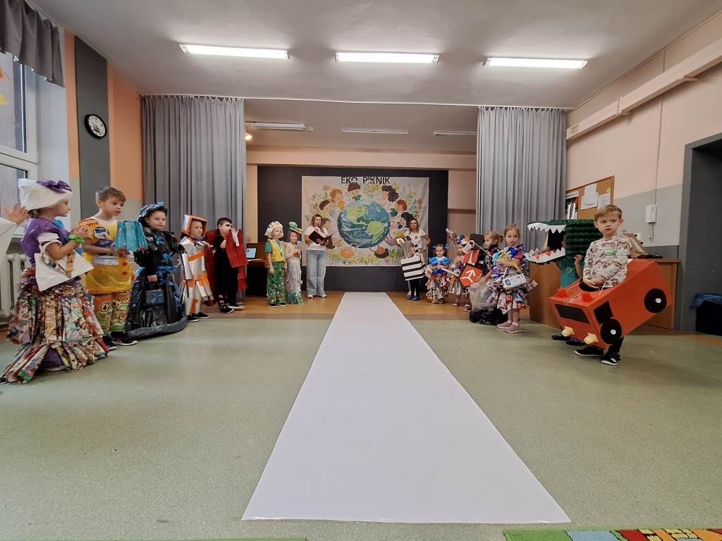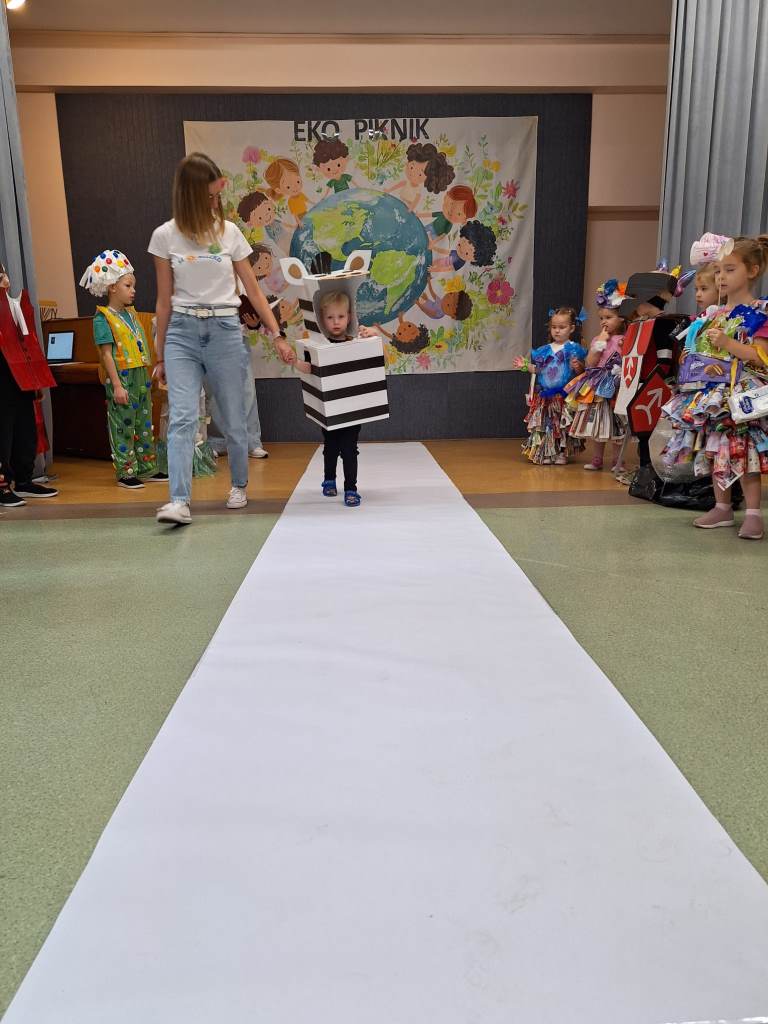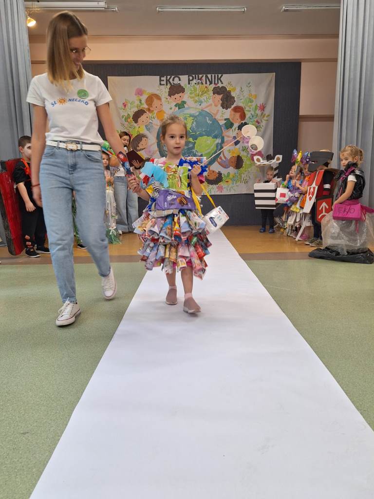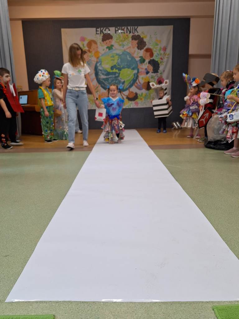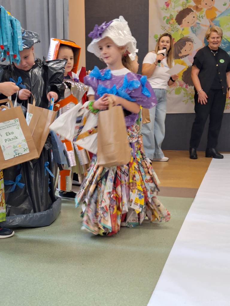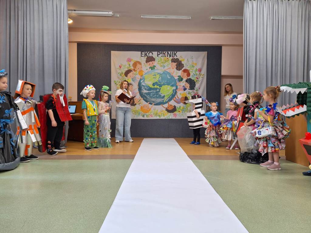 Eko Piknik okazał się wydarzeniem pełnym radości i kreatywności, a największą atrakcją okazał się ekologiczny pokaz mody. Dzieci zaprezentowały stroje wykonane wspólnie z rodzicami z materiałów przezznaczonych do recyklingu - papieru, folii, tektury czy butelek plastikowych, a maili modele z dumą prezentowali swoje kreacje na specjalnie przygotowanym "ekologicznym wybiegu". Gośćmi specjalnymi eko pokazu byli uczniowe klas pierwszych Szkoły Podstawowej w Kotlinie. Wspólna zabawa wzmocniła współracę ze szkołą podstawową i zaangażowanie całej spłeczności przedszkolnej.