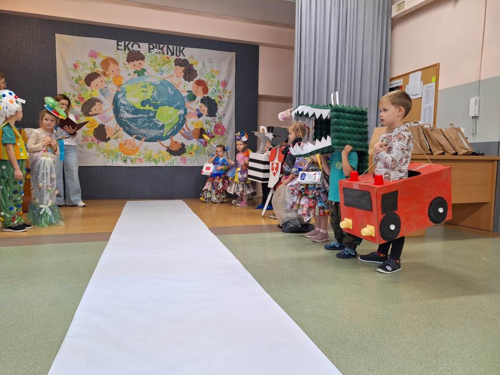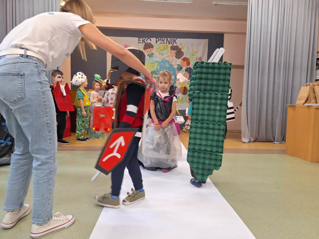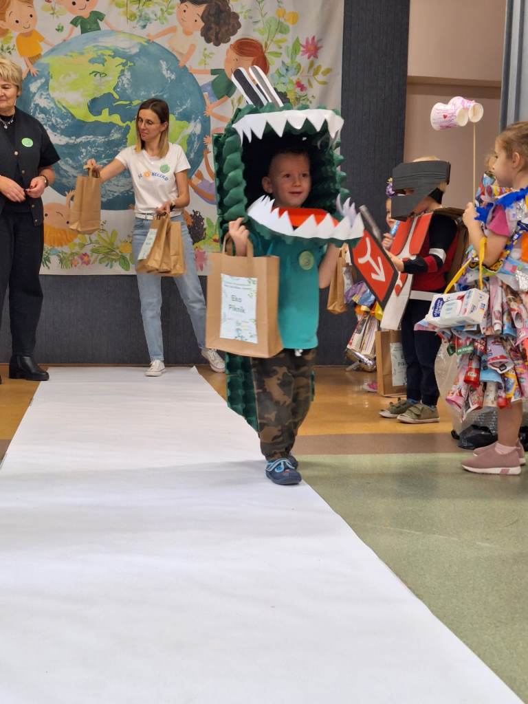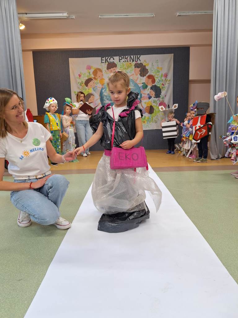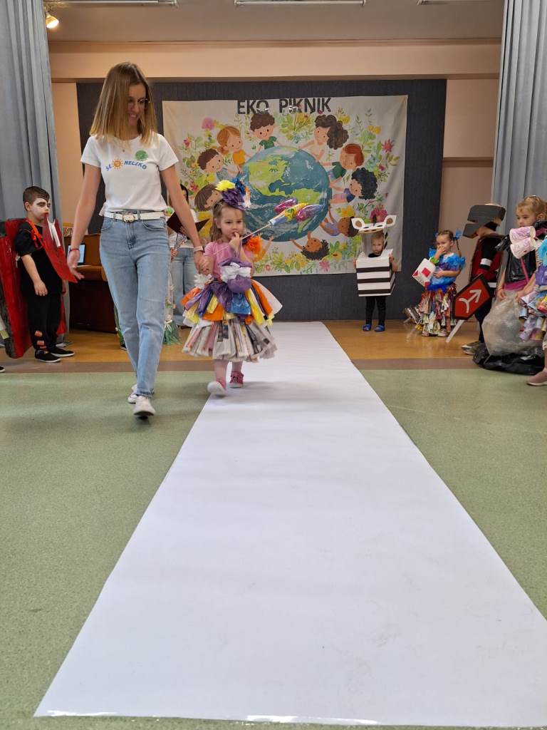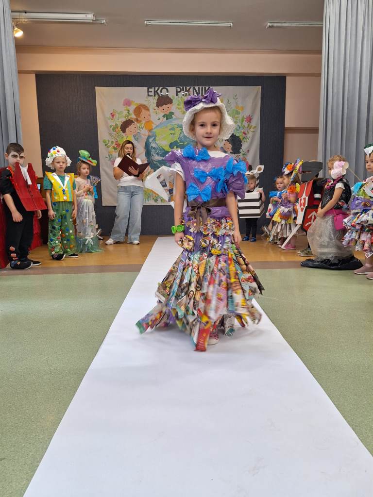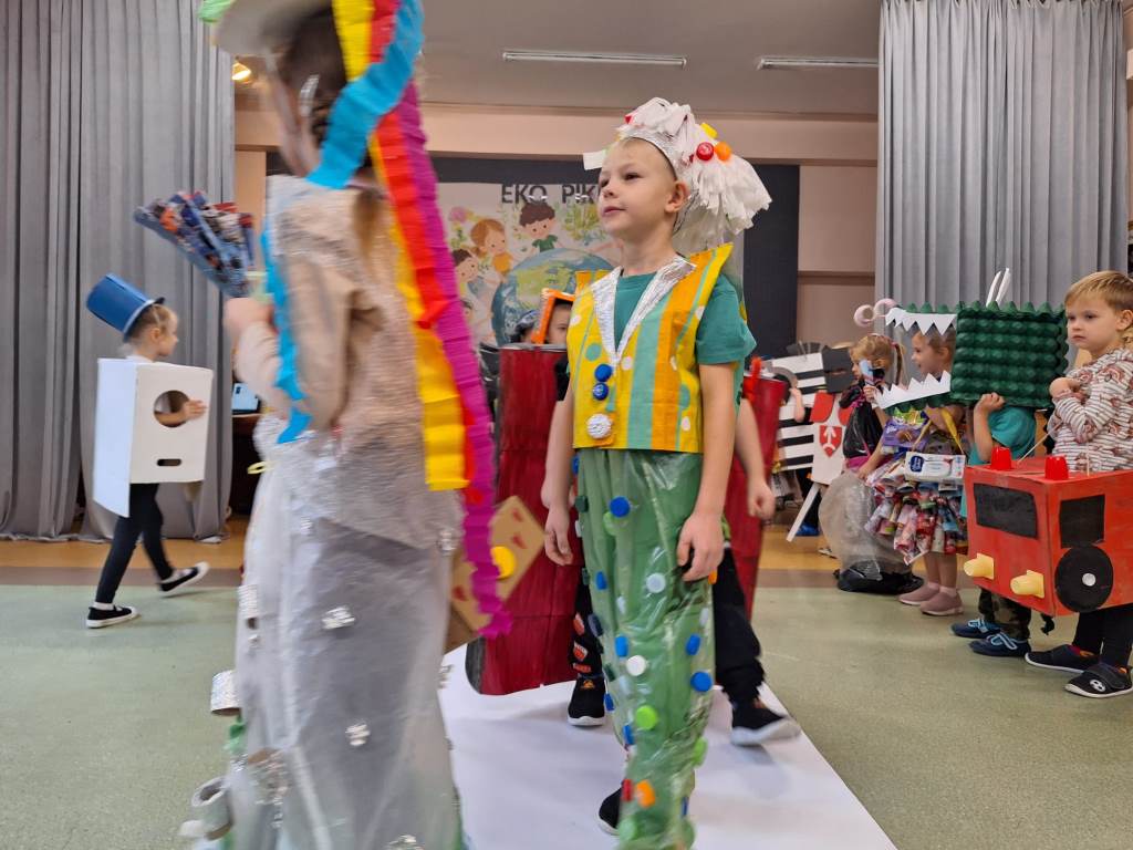 Eko Piknik okazał się wydarzeniem pełnym radości i kreatywności, a największą atrakcją okazał się ekologiczny pokaz mody. Dzieci zaprezentowały stroje wykonane wspólnie z rodzicami z materiałów przezznaczonych do recyklingu - papieru, folii, tektury czy butelek plastikowych, a maili modele z dumą prezentowali swoje kreacje na specjalnie przygotowanym "ekologicznym wybiegu". Gośćmi specjalnymi eko pokazu byli uczniowe klas pierwszych Szkoły Podstawowej w Kotlinie. Wspólna zabawa wzmocniła współracę ze szkołą podstawową i zaangażowanie całej spłeczności przedszkolnej.