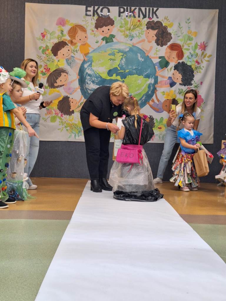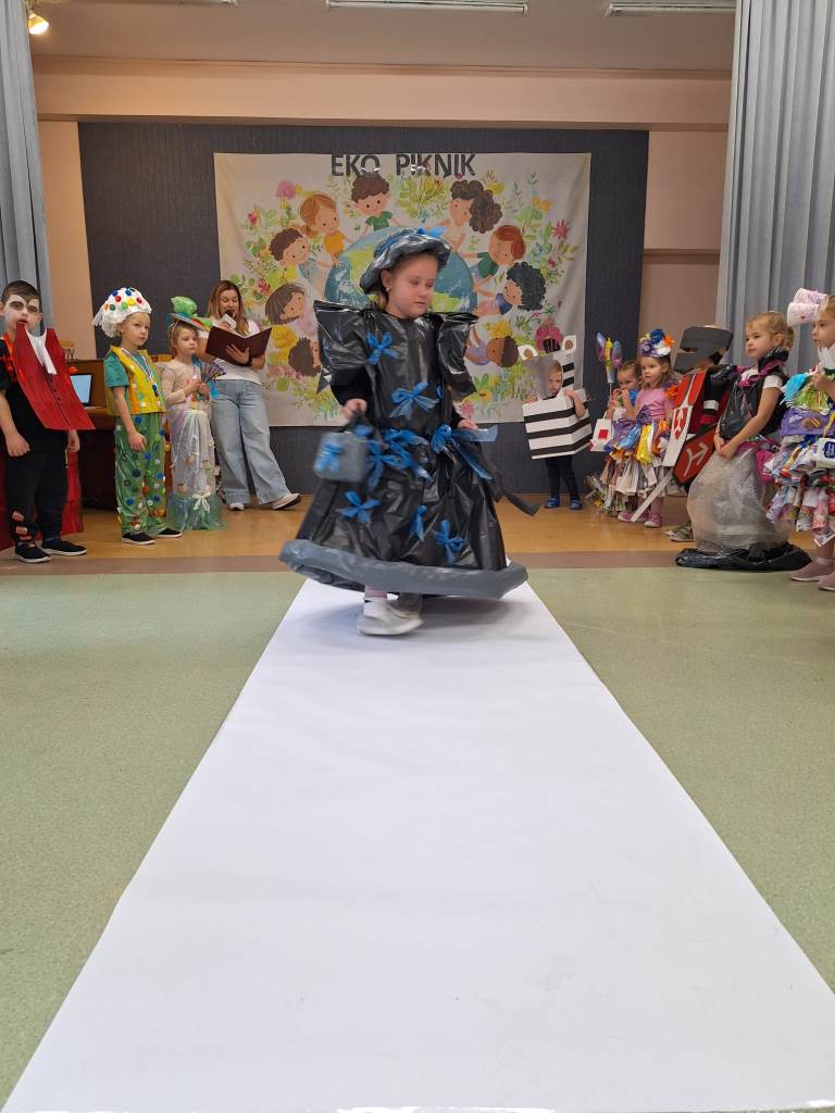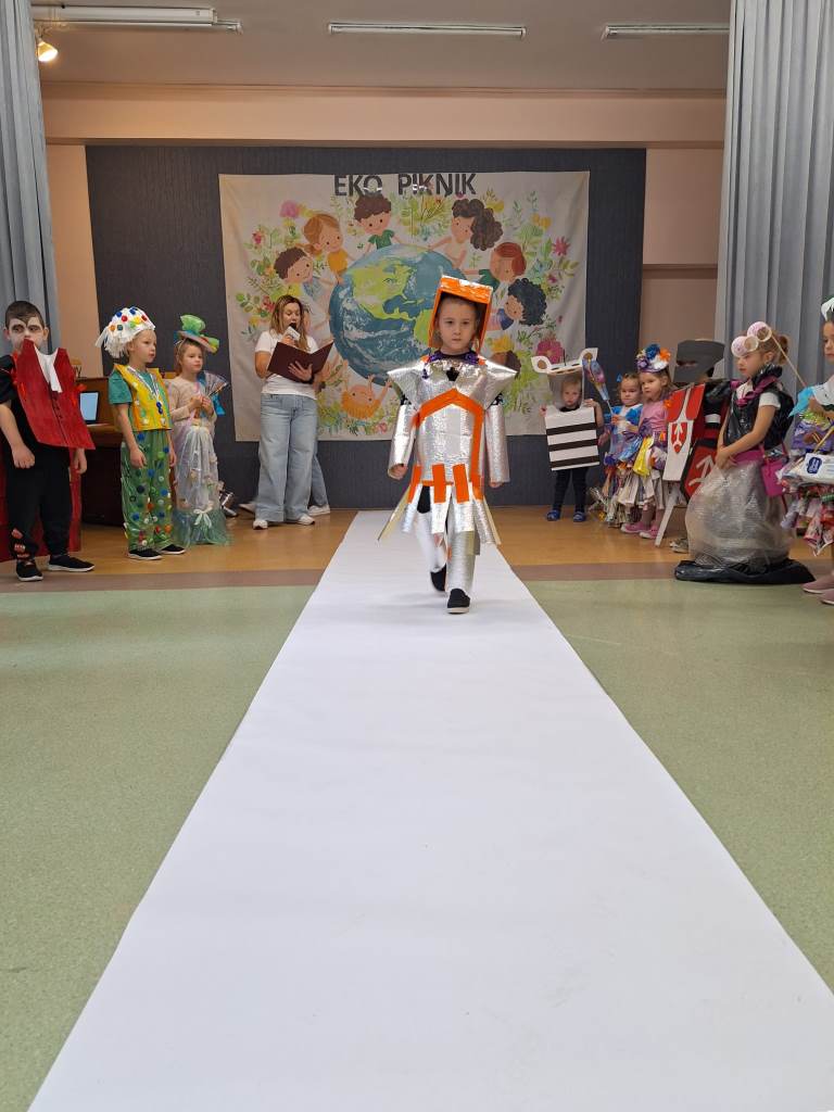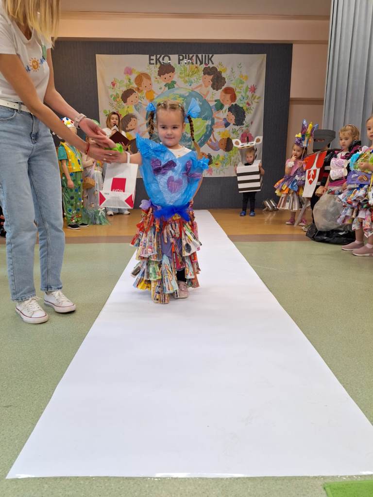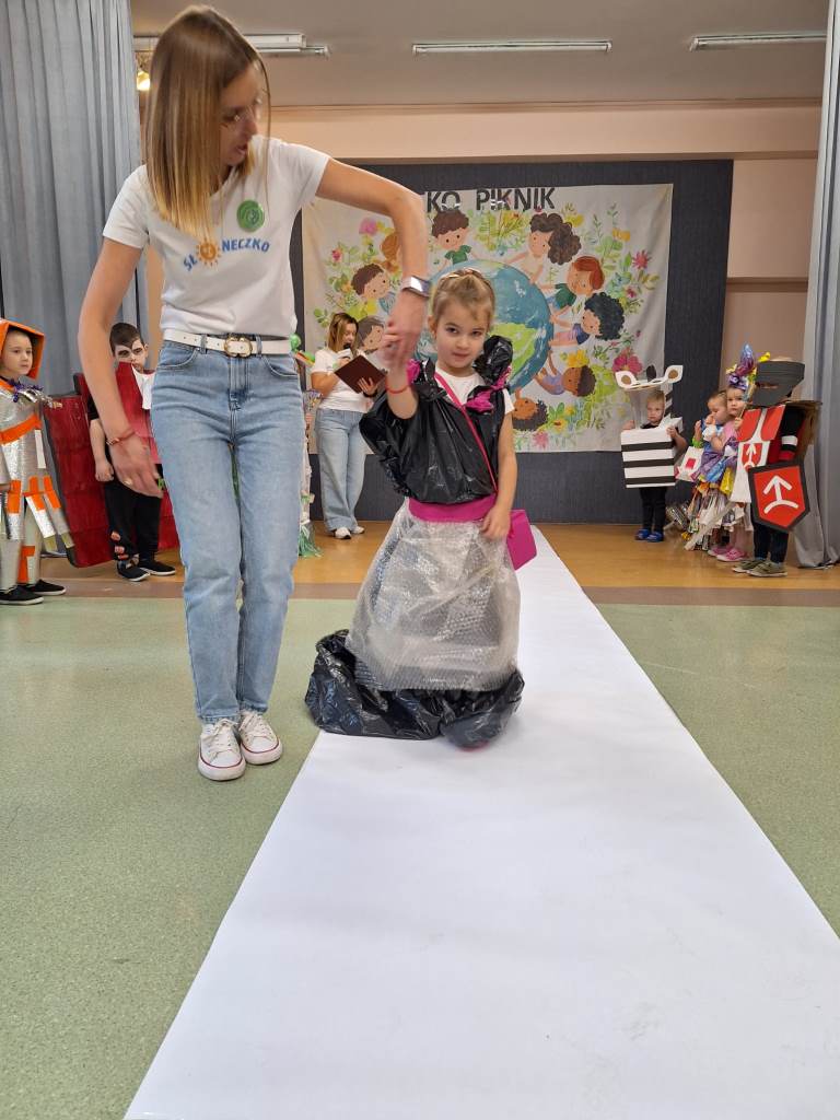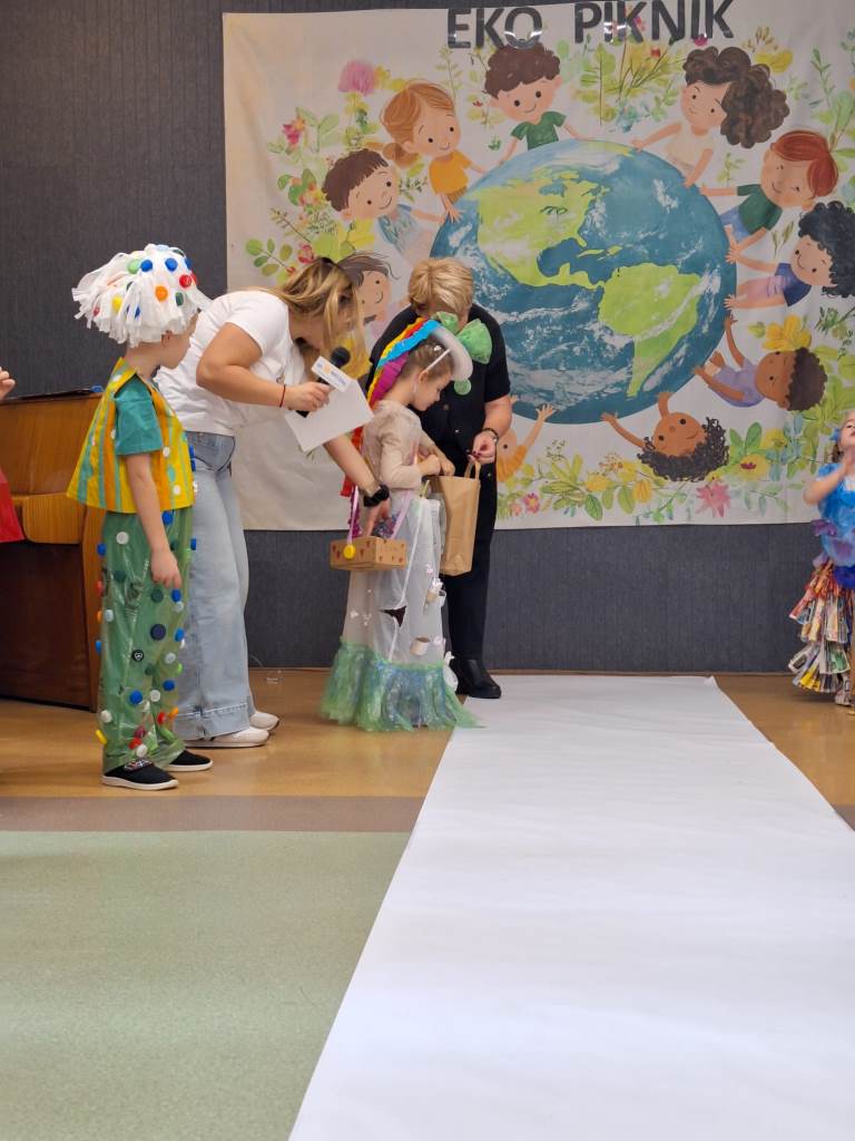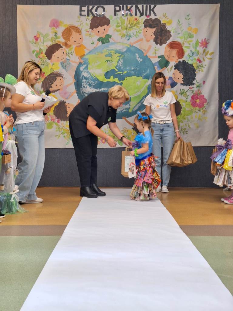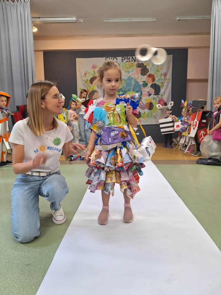 Eko Piknik okazał się wydarzeniem pełnym radości i kreatywności, a największą atrakcją okazał się ekologiczny pokaz mody. Dzieci zaprezentowały stroje wykonane wspólnie z rodzicami z materiałów przezznaczonych do recyklingu - papieru, folii, tektury czy butelek plastikowych, a maili modele z dumą prezentowali swoje kreacje na specjalnie przygotowanym "ekologicznym wybiegu". Gośćmi specjalnymi eko pokazu byli uczniowe klas pierwszych Szkoły Podstawowej w Kotlinie. Wspólna zabawa wzmocniła współracę ze szkołą podstawową i zaangażowanie całej spłeczności przedszkolnej.