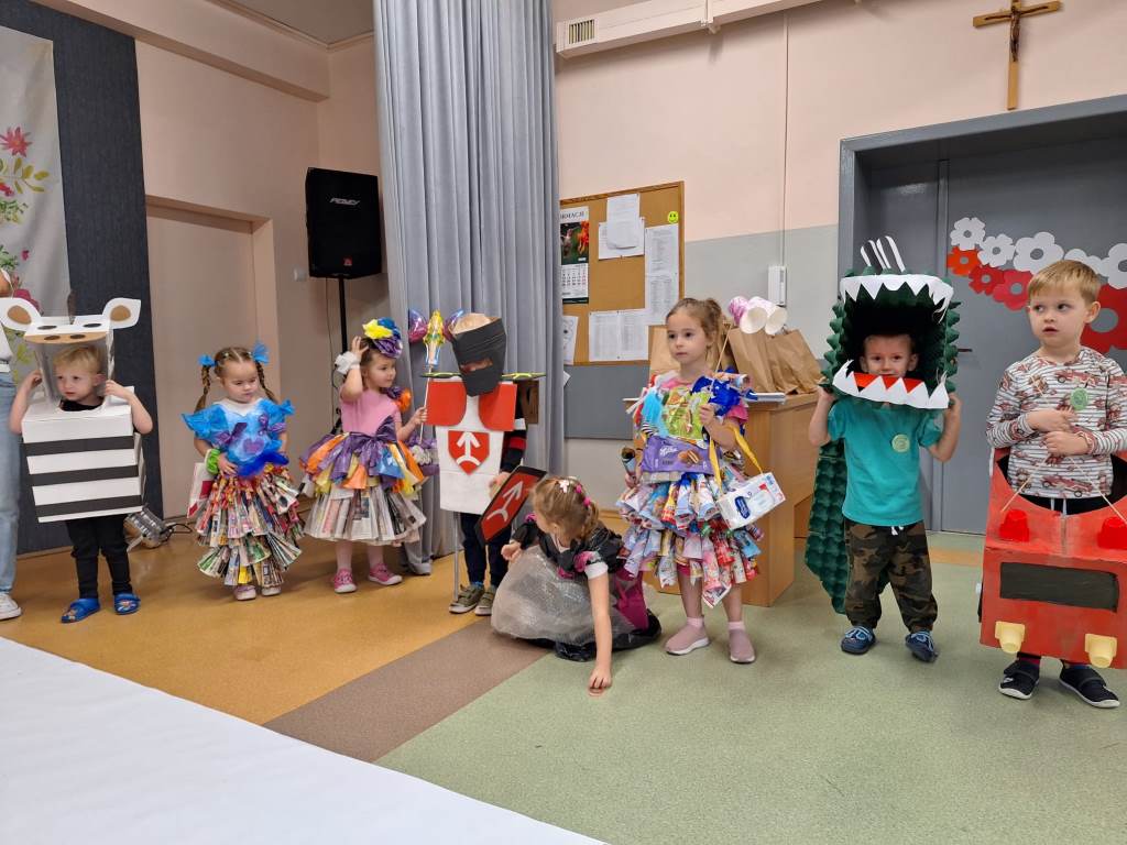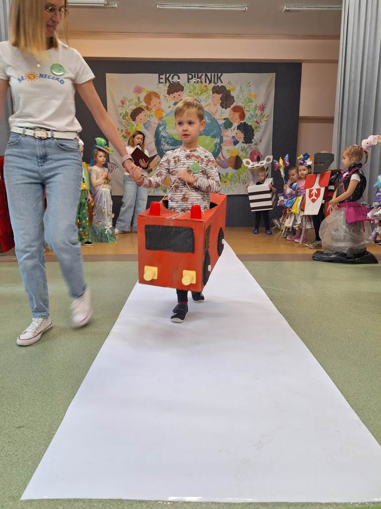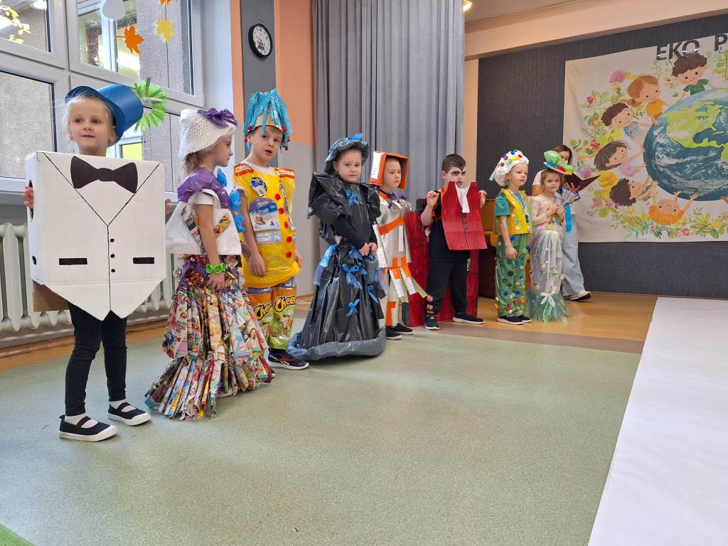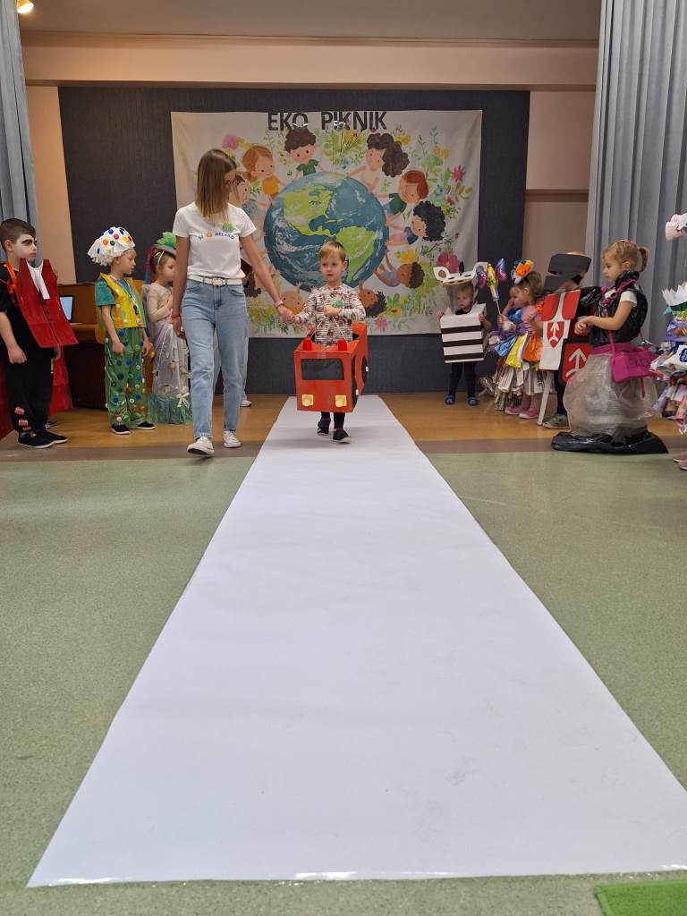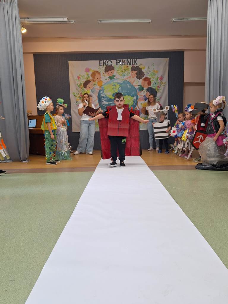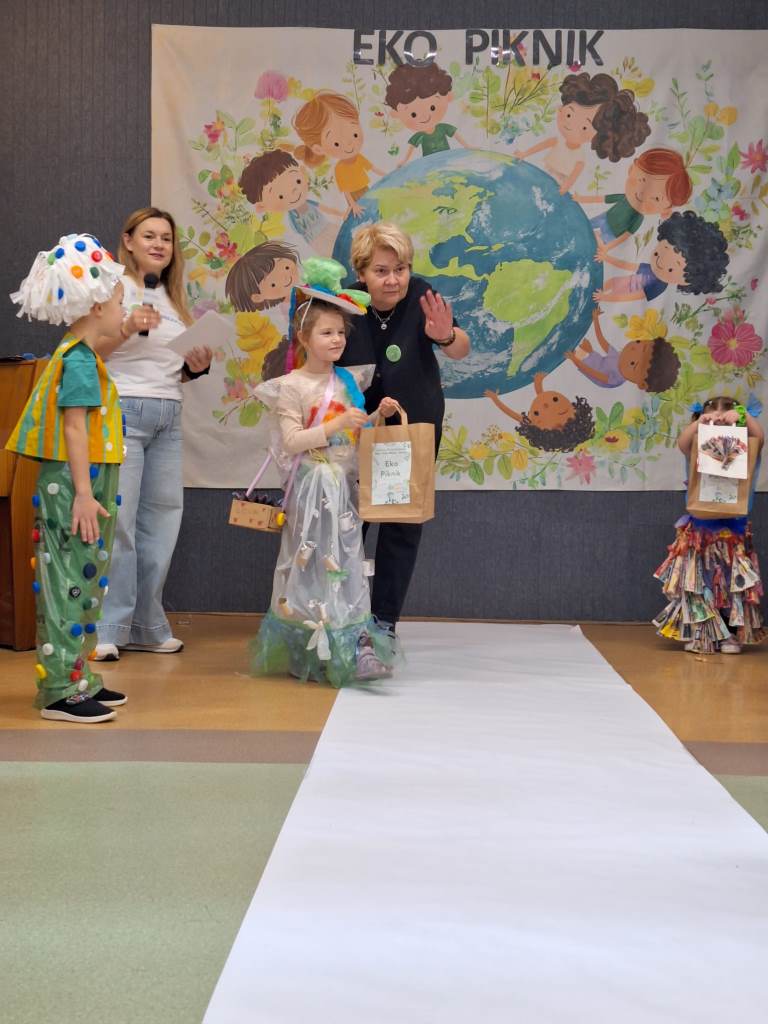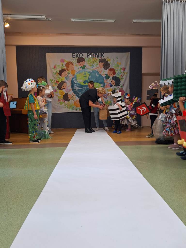 Eko Piknik okazał się wydarzeniem pełnym radości i kreatywności, a największą atrakcją okazał się ekologiczny pokaz mody. Dzieci zaprezentowały stroje wykonane wspólnie z rodzicami z materiałów przezznaczonych do recyklingu - papieru, folii, tektury czy butelek plastikowych, a maili modele z dumą prezentowali swoje kreacje na specjalnie przygotowanym "ekologicznym wybiegu". Gośćmi specjalnymi eko pokazu byli uczniowe klas pierwszych Szkoły Podstawowej w Kotlinie. Wspólna zabawa wzmocniła współracę ze szkołą podstawową i zaangażowanie całej spłeczności przedszkolnej.