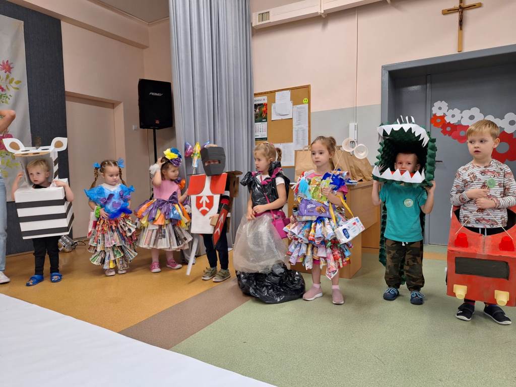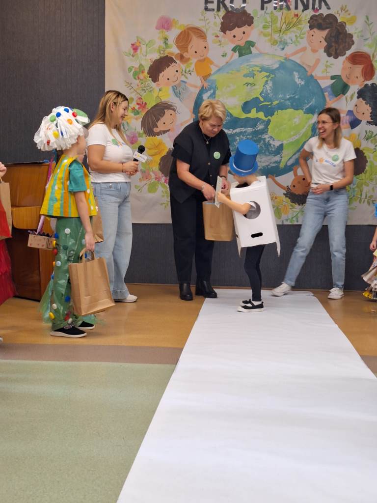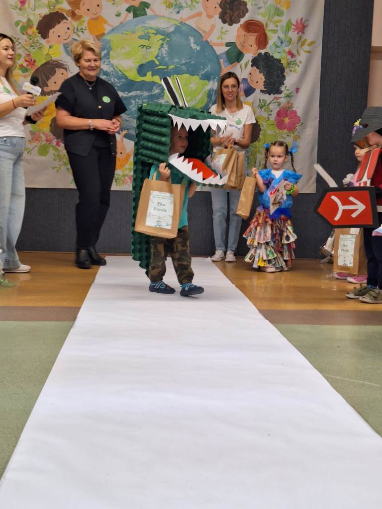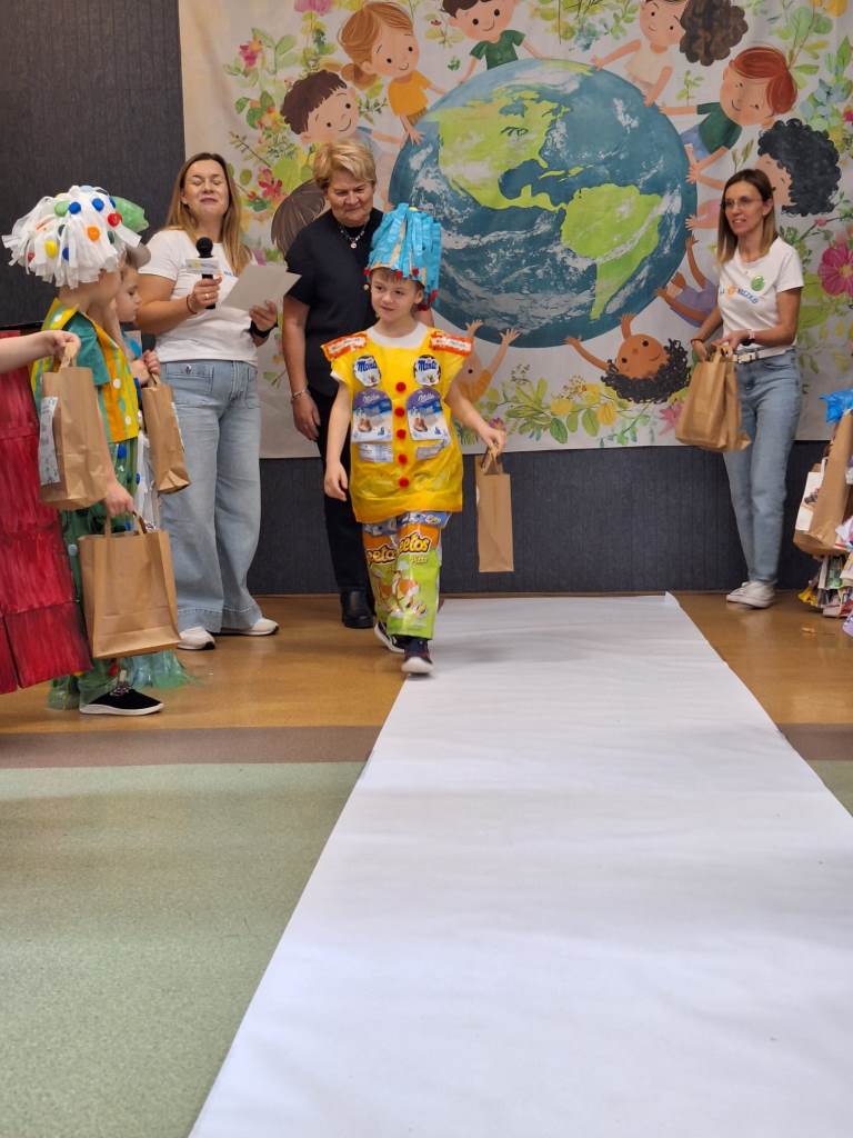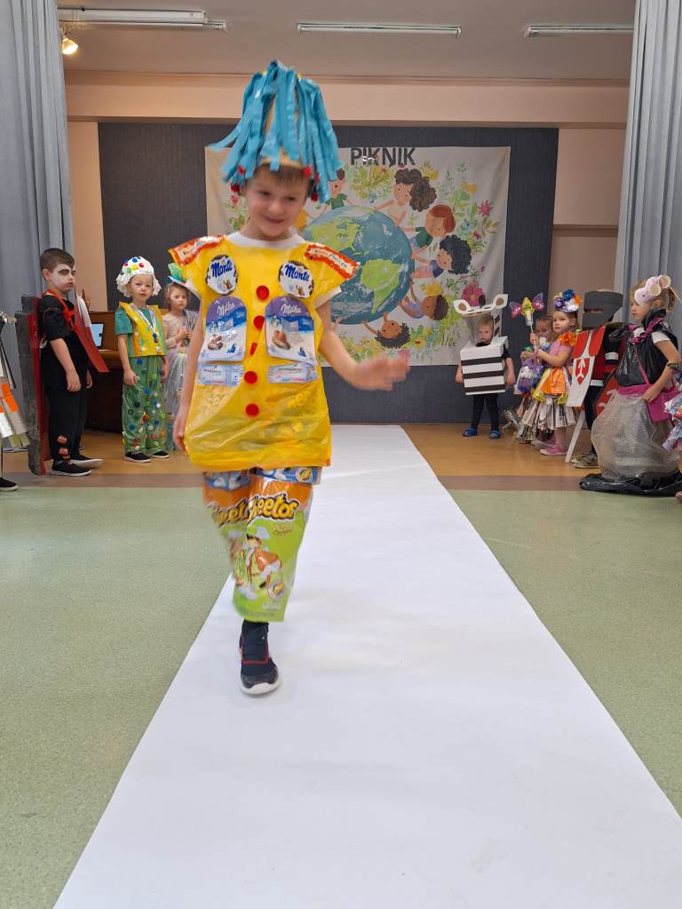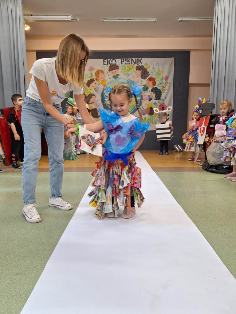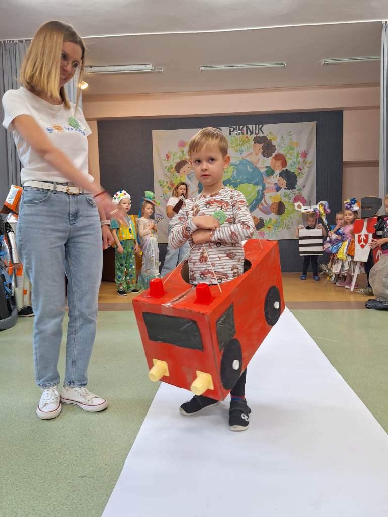 Eko Piknik okazał się wydarzeniem pełnym radości i kreatywności, a największą atrakcją okazał się ekologiczny pokaz mody. Dzieci zaprezentowały stroje wykonane wspólnie z rodzicami z materiałów przezznaczonych do recyklingu - papieru, folii, tektury czy butelek plastikowych, a maili modele z dumą prezentowali swoje kreacje na specjalnie przygotowanym "ekologicznym wybiegu". Gośćmi specjalnymi eko pokazu byli uczniowe klas pierwszych Szkoły Podstawowej w Kotlinie. Wspólna zabawa wzmocniła współracę ze szkołą podstawową i zaangażowanie całej spłeczności przedszkolnej.